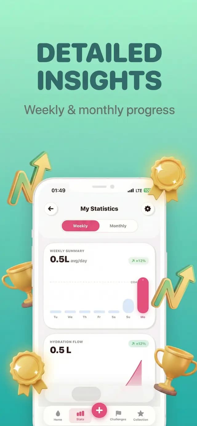 Visual charts show your hydration trends over days and weeks. See how consistency improves your energy and focus.